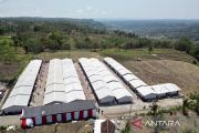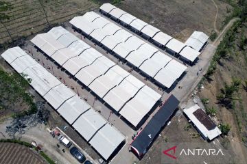 Foto udara kompleks rumah hunian sementara (huntara) warga terdampak bencana tanah gerak di Dusun Sumberurip Desa Purworejo Kecamatan Wates, Blitar, Rabu (11/10/2023). Pemprov Jatim bekerja sama dengan BNPB mendirikan 50 unit huntara untuk 50 kepala keluarga dari total 118 kepala keluarga terdampak bencana tanah gerak yang diperkirakan bisa ditempati warga selama tiga hingga empat tahun, dan diharapkan selama kurun waktu itu warga bisa mandiri untuk membangun sendiri hunian tetap di lahannya masing-masing yang aman. ANTARA FOTO/Irfan Anshori/tom.