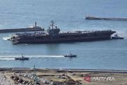 Kapal induk AS Ronald Reagan berlabuh di pelabuhan Busan, Korea Selatan (12/10/2023). Kapal induk bertenaga nuklir tersebut berkunjung ke Korsel di tengah meningkatnya ketegangan dengan Korea Utara. ANTARA FOTO/Kyodo via Reuters/tom.
