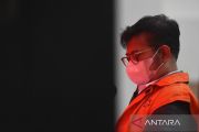 Mantan Menteri Pertanian Syahrul Yasin Limpo mengenakan rompi tahanan KPK di Gedung Merah Putih KPK, Jakarta, Jumat (13/10/2023). KPK menahan mantan Menteri Pertanian Syahrul Yasin Limpo dan Direktur Alat dan Mesin Pertanian Kementan Muhammad Hatta sebagai tersangka dalam kasus dugaan korupsi pemerasan dalam jabatan dan penerimaan gratifikasi di lingkungan Kementerian Pertanian. ANTARA FOTO/Indrianto Eko Suwarso/rwa.