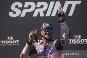 Pembalap Prima Pramac Racing Jorge Martin melakukan selebrasi usai memenangi Sprint Race MotoGP seri ke-15 di Pertamina Mandalika International Street Circuit, Lombok Tengah, NTB, Sabtu (14/10/2023). Jorge Martin berhasil menjuarai Sprint Race diikuti pembalap Mooney VR46 Racing Team Luca Marini dan Marco Bezzecchi. ANTARA FOTO/Wahyu Putro A/aww.
