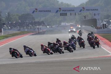 Pembalap Prima Pramac Racing Jorge Martin (kedua kiri) bersama pembalap lain memacu kecepatan pada balapan Sprint Race MotoGP seri ke-15 di Pertamina Mandalika International Street Circuit, Lombok Tengah, NTB, Sabtu (14/10/2023). Jorge Martin berhasil menjuarai Sprint Race diikuti pembalap Mooney VR46 Racing Team Luca Marini dan Marco Bezzecchi. ANTARA FOTO/Wahyu Putro A/aww.