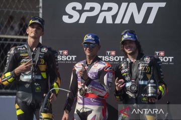 Pembalap Prima Pramac Racing Jorge Martin (tengah) bersama pembalap Mooney VR46 Racing Team Luca Marini (kiri) dan Marco Bezzecchi (kanan) berpose usai pengalungan medali juara Sprint Race MotoGP seri Indonesia di Pertamina Mandalika International Street Circuit, Lombok Tengah, NTB, Sabtu (14/10/2023). Jorge Martin berhasil menjuarai Sprint Race diikuti pembalap Mooney VR46 Racing Team Luca Marini dan Marco Bezzecchi. ANTARA FOTO/Wahyu Putro A/aww.