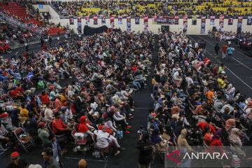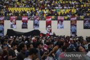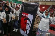 Ribuan relawan mengikuti syukuran dan deklarasi Jateng Bergerak untuk Gibran 2024 di GOR Jatidiri, Semarang, Jawa Tengah, Selasa (17/10/2023). Kegiatan yang dihadiri relawan Gibran dari berbagai elemen masyarakat se-Jawa Tengah itu digelar sebagai syukuran atas keputusan Mahkamah Konstitusi (MK) mengabulkan gugatan terkait syarat pendaftaran capres-cawapres yang harus berusia 40 tahun atau berpengalaman sebagai kepala daerah, sehingga Wali Kota Solo tersebut dapat maju pada Pilpres 2024 mendatang. ANTARA FOTO/Makna Zaezar/Spt.