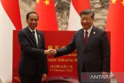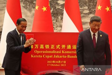 Presiden Joko Widodo (kiri) dan Presiden China Xi Jinping saat menghadiri Operasionalisasi Komersial Kereta Cepat Jakarta-Bandung di Great Hall of the People, Beijing, China, Selasa (17/10/2023). Dalam acara tersebut Presiden Jokowi dan Presiden Xi Jinping juga menyaksikan sejumlah nota kesepahaman (MoU) yang ditandatangani oleh para menteri kedua negara di berbagai bidang. ANTARA FOTO/Desca Lidya Natalia/Spt.
