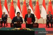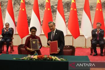 Presiden Joko Widodo (kiri) dan Presiden China Xi Jinping (kanan) menyaksikan penandatanganan sejumlah nota kesepahaman (MoU) oleh para menteri di Great Hall of the People, Beijing, China, Selasa (17/10/2023). Penandatanganan MoU tersebut dilakukan pasca kedua kepala negara melakukan pertemuan bilateral untuk membahas kerja sama di berbagai bidang. ANTARA FOTO/Desca Lidya Natalia/Spt.