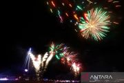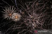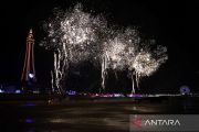 Atraksi kembang api di depan Menara Blackpool pada Kejuaraan Dunia Kembang Api di Blackpool, Inggris (20/10/2023). ANTARA FOTO/REUTERS/Molly Darlington/tom.