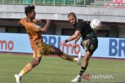 Pesepak bola Ps Barito Renan Alves (tengah) melakukan selebrasi usai mencetak gol ke gawang Bhayangkara Presisi Indonesia FC pada pertandingan Liga 1 di Stadion Patriot Chandrabhaga, Bekasi, Jawa Barat, Sabtu (21/10/2023). Pertandingan berakhir imbang dengan skor imbang 1-1. ANTARA FOTO/Fakhri Hermansyah/tom.