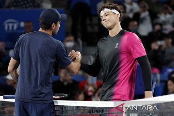 Petenis AS Ben Shelton menyalami petenis Rusia Aslan Karatsev setelah mengalahkannya pada final tunggal putra Japan Open 2023 di Ariake Coliseum, Tokyo, Jepang, Minggu (22/10/2023). Ben Shelton berhasil mengalahkan Aslan Karatsev dengan 7-5, 6-1. ANTARA FOTO/REUTERS/Androniki Christodoulou/Spt.