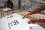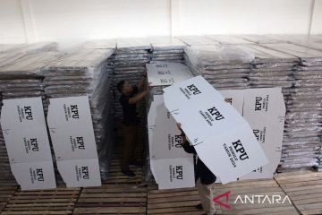 Petugas menata kotak suara Pemilu 2024 di gudang Komisi Pemilhan Umum (KPU) Deli Serdang, Sumatera Utara, Selasa (24/10/2023). KPU Sumatera Utara menerima sebanyak 183.500 kotak suara yang akan dibagikan ke 33 kabupaten/kota di provinsi itu pada Pemilu 2024. ANTARA FOTO/Yudi/aww.
