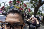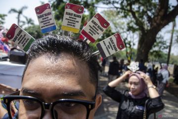 Anggota PPK Pemilu Kota Bandung menggunakan alat peraga sosialisasi saat acara Kirab Pemilu 2024 di Lapangan Tegalega, Bandung, Jawa Barat, Kamis (26/10/2023). Kegiatan tersebut sebagai bentuk sosialisasi dan edukasi guna meningkatkan partisipasi pemilih pada pemilu 2024 yang ditargetkan KPU RI mampu sedikitnya 82 persen di seluruh Indonesia. ANTARA FOTO/Novrian Arbi/hp.