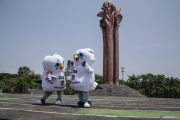 Maskot Pemilu 2024 Sura dan Sulu melakukan sosialisasi saat acara Kirab Pemilu 2024 di Lapangan Tegalega, Bandung, Jawa Barat, Kamis (26/10/2023). Kegiatan tersebut sebagai bentuk sosialisasi dan edukasi guna meningkatkan partisipasi pemilih pada pemilu 2024 yang ditargetkan KPU RI mampu sedikitnya 82 persen di seluruh Indonesia. ANTARA FOTO/Novrian Arbi/hp.