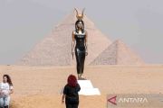 Sejumlah pengunjung mengamati karya seni dalam pameran seni internasional bertajuk "Forever Is Now" di objek wisata Piramida Giza, Giza, Mesir, Kamis (26/10/2023). Pameran bertajuk "Forever Is Now" yang diikuti 14 seniman internasional itu berlangsung dari 26 Oktober hingga 18 November. ANTARA FOTO/Xinhua/Ahmed Gomaa/rwa.