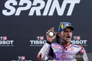 Pembalap Prima Pramac Racing Jorge Martin merayakan kemenangan sprint race MotoGP Thailand Grand Prix di Chang International Circuit, Buriram, Thailand (28/10/2023). Kemenangan tersebut membuka peluangnya sebagai juara dunia masih terbuka lebar karena selisih poin dengan peringkat pertama kejuaraan Francesco Bagnaia semakin menipis menjadi 18 poin saja. ANTARA FOTO/REUTERS/Athit Perawonmetha/aww.