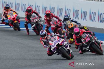 Aksi pebalap Prima Pramac Racing Jorge Martin (tengah) saat balapan MotoGP Thailand di Chang International Circuit, Buriram, Thailand, Minggu (29/10/2023). ANTARA FOTO/REUTERS/Athit Perawonmetha/rwa.