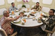 Presiden Joko Widodo (kedua kiri) bersama bakal calon presiden Prabowo Subianto (kedua kanan), Ganjar Pranowo (kiri) dan Anies Baswedan (kanan) makan siang bersama saat melakukan pertemuan di Istana Merdeka, Jakarta, Senin (30/10/2023). ANTARA FOTO/Hafidz Mubarak A/foc.