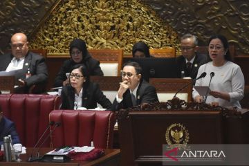 Ketua DPR Puan Maharani (kanan) menyampaikan pidato pada Rapat Paripurna Pembukaan Masa Persidangan II Tahun Sidang 2023-2024 di Gedung Nusantara II, Komplek Parlemen, Senayan, Jakarta, Selasa (31/10/2023). Rapat berisi penyampaian pidato pembukaan masa persidangan oleh Ketua DPR serta pelantikan Pengganti Antarwaktu (PAW) anggota DPR dan anggota MPR sisa masa jabatan tahun 2019-2024. ANTARA FOTO/Indrianto Eko Suwarso/Spt.
