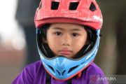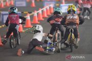 Seorang pembalap sepeda cilik terjatuh saat kompetisi Push Bike Journalist MTB 2023 di Pasar Modern Intermoda BSD City, Kabupaten Tangerang, Banten, Sabtu (4/11/2023). Lomba yang diikuti ratusan pembalap sepeda berusia 2-7 tahun itu selain untuk menanamkan jiwa sportivitas sejak dini juga sebagai ajang pencarian talenta atlet balap sepeda Indonesia di masa depan. ANTARA FOTO/Andika Wahyu/nym.