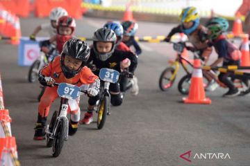 Sejumlah pembalap sepeda cilik memacu kecepatan saat kompetisi Push Bike Journalist MTB 2023 di Pasar Modern Intermoda BSD City, Kabupaten Tangerang, Banten, Sabtu (4/11/2023). Lomba yang diikuti ratusan pembalap sepeda berusia 2-7 tahun itu selain untuk menanamkan jiwa sportivitas sejak dini juga sebagai ajang pencarian talenta atlet balap sepeda Indonesia di masa depan. ANTARA FOTO/Andika Wahyu/nym.
