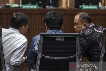 Terdakawa kasus korupsi penyediaan infrastruktur BTS 4G dan infrastruktur pendukung BAKTI Kominfo Irwan Hermawan (kanan) berbincang dengan Galumbang Menak (kiri) dan Mukti Ali (tengah) saat menjalani sidang putusan di Pengadilan Tipikor, Jakarta, Kamis (9/11/2023). Majelis Hakim memvonis Komisaris PT Solitech Media Sinergy Irwan Hermawan dengan hukuman penjara 12 tahun dan denda Rp500 juta subsider empat bulan kurungan serta pidana tambahan membayar uang pengganti Rp1.150.000.000 subsider satu tahun kurungan. ANTARA FOTO/Bayu Pratama S/aww.