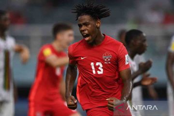 Pesepak bola Timnas Kanada Richard Chukwu merayakan golnya ke gawang Timnas Mali dalam pertandingan penyisihan Grup B Piala Dunia U-17 2023 di Stadion Gelora Bung Tomo (GBT), Surabaya, Jawa Timur, Kamis (16/11/2023). ANTARA FOTO/Aditya Pradana Putra/rwa.
