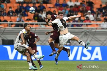 Pesepak bola Timnas Jerman Robert Ramsak (kanan) berebut bola di udara dengan pesepak bola Timnas Venezuela Angel Borgo (kedua kanan) saat bertanding dalam penyisihan Grup F Piala Dunia U-17 2023 di Jakarta International Stadium, Jakarta, Sabtu (18/11/2023). Jerman mengalahkan Venezuela dengan skor 3-0. ANTARA FOTO/Sigid Kurniawan/YU