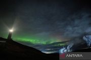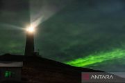 Cahaya Utara atau juga disebut Aurora Borealis menerangi langit malam di atas Mercusuar Reykjanes dekat kota Grindavik, Islandia, Minggu (19/11/2023). Cahaya itu terjadi karena adanya koalisi antara partikel bermuatan listrik yang terpantul dari matahari dan partikel gas bumi di atmosfer bumi. ANTARA FOTO/REUTERS/Marko Djurica/Spt.