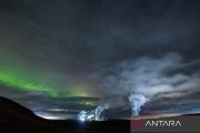 Cahaya Utara atau juga disebut Aurora Borealis menerangi langit malam di atas sumber air panas Gunnuhver dekat kota Grindavik, Islandia, Minggu (19/11/2023). Cahaya itu terjadi karena adanya koalisi antara partikel bermuatan listrik yang terpantul dari matahari dan partikel gas bumi di atmosfer bumi. ANTARA FOTO/REUTERS/Marko Djurica/Spt.