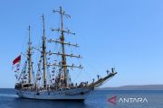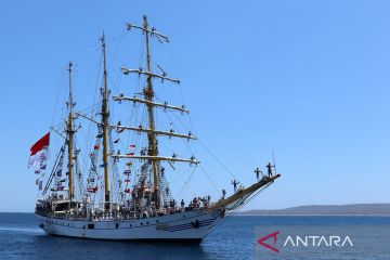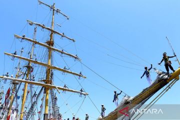 Sejumlah Taruna-taruni AAL berdiri di atas tiang layar KRI Dewa Ruci yang akan sandar di Pelabuhan Tanjungwangi, Bayuwangi, Jawa Timur, Senin (20/11/2023). Kedatangan KRI Dewa Ruci dan KRI Makassar-590 yang membawa 187 Taruna-taruni tingkat II Akademi Angkatan Laut ke-71 itu untuk melaksanakan latihan praktek (Lattek) Jalasesya dan pengabdian kepada masyarakat. ANTARA FOTO/Budi Candra Setya/Spt.