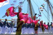 Penari gandrung menyambut kedatangan KRI Dewa Ruci yang membawa Taruna-taruni AAL di Pelabuhan Tanjungwangi, Bayuwangi, Jawa Timur, Senin (20/11/2023). Kedatangan KRI Dewa Ruci dan KRI Makassar-590 yang membawa 187 Taruna-taruni tingkat II Akademi Angkatan Laut ke-71 itu untuk melaksanakan latihan praktek (Lattek) Jalasesya dan pengabdian kepada masyarakat. ANTARA FOTO/Budi Candra Setya/Spt.