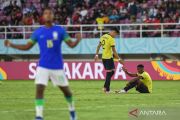 Pesepak bola Timnas Brazil U-17 berselebrasi bersama ofisial usai menang atas Timnas Ekuador U-17 pada babak 16 Besar Piala Dunia U-17 2023 di Stadion Manahan, Solo, Jawa Tengah, Senin (20/11/2023). Brazil menang skor 3-1. ANTARA FOTO/Mohammad Ayudha/aww.