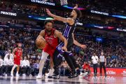 Pebasket New Orleans Pelicans eremiah Robinson-Earl (50) melewati pebasket Sacramento Kings Chris Duarte (3) dalam laga NBA di Smoothie King Center, New Orleans, Louisiana, AS (20/11/2023). New Orleans Pelicans menang dengan skor 129-93. ANTARA FOTO/Stephen Lew-USA TODAY Sports via Reuters/tom.