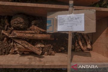 Bagian tulang manusia terkumpul saat proses relokasi makam warga di Ngabeyan, Karanganom, Klaten, Jawa Tengah, Selasa (21/11/2023). Sebanyak 110 makam warga direlokasikan ke tempat pemakaman yang baru karena untuk pembangunan Jalan Tol Solo-Yogyakarta. ANTARA FOTO/Aloysius Jarot Nugroho/tom.