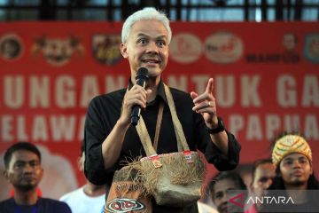 Calon presiden nomor urut tiga Ganjar Pranowo menyapa para relawan dan simpatisannya di Lapangan PTC Entrop, Kota Jayapura, Papua, Selasa (21/11/2023). Dalam kegiatan tersebut Ganjar menyampaikan orasi politiknya dihadapan 5.000 relawan Ganjar Pranowo-Mahfud. ANTARA FOTO/Gusti Tanati/YU