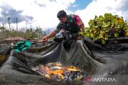 Anggota TNI AD Pembina Desa (Babinsa) Koramil 1508-Galela Sersan Mayor Ardi Wijaya mengambil ikan nila yang dibudidayakan di Danau Talaga Duma, Desa Togawa Besi, Kabupaten Halmahera Utara, Maluku Utara, Rabu (22/11/2023). Sersan Mayor Ardi Wijaya memanfaatkan Danau Talaga Duma untuk budi daya ikan nila dengan menggunakan sistem keramba apung itu sejak 2016 yang digunakan untuk memenuhi permintaan sejumlah rumah makan di Tobelo dengan harga jual Rp60 ribu per kilogram serta dijadikan motivasi untuk masyarakat membudidayakan ikan nila. ANTARA FOTO/Andri Saputra/rwa.