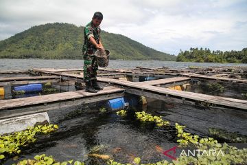Anggota TNI AD Pembina Desa (Babinsa) Koramil 1508-Galela Sersan Mayor Ardi Wijaya memberi makan ikan nila yang dibudidayakan di Danau Talaga Duma, Desa Togawa Besi, Kabupaten Halmahera Utara, Maluku Utara, Rabu (22/11/2023). Sersan Mayor Ardi Wijaya memanfaatkan Danau Talaga Duma untuk budi daya ikan nila dengan menggunakan sistem keramba apung itu sejak 2016 yang digunakan untuk memenuhi permintaan sejumlah rumah makan di Tobelo dengan harga jual Rp60 ribu per kilogram serta dijadikan motivasi untuk masyarakat membudidayakan ikan nila. ANTARA FOTO/Andri Saputra/rwa.