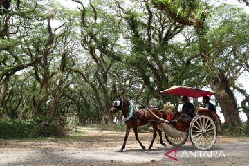 Delman Wisata melintasi hutan Djawatan di Banyuwangi, Jawa Timur, Kamis (23/11/2023). Hutan pohon trembesi berusia ratusan tahun seluas 9 hektare yang berada di lahan milik Perhutani tersebut dahulu menjadi Tempat Penimbunan Kayu (TPK) namun sejak tahun 2018 diresmikan menjadi tempat wisata unggulan di Banyuwangi hingga sekarang. ANTARA FOTO/Budi Candra Setya/aww.