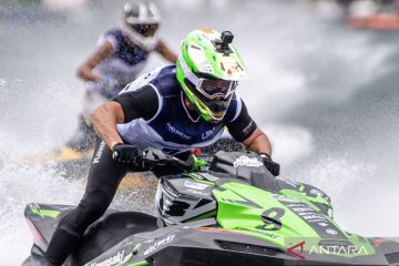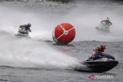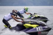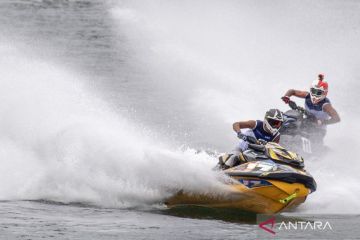 Sejumlah pembalap beradu kecepatan pada pertandingan Aquabike Endurance Dairi Cup Grand Prix Of Indonesia di Pantai Silalahi Desa Silalahi III, Kecamatan Silahsabungan, Kabupaten Dairi, Sumatera Utara, Kamis (23/11/2023). Pembalap asal Prancis Jean Bruno Pastorello berhasil menjadi juara pertama dengan total raihan 45 poin disusul juara kedua diraih pembalap asal Uni Emirat Arab Rashed Aldawas dengan 44 poin dan juara ketiga pembalap asal Spanyol Alejandro Molina Miranda dengan 38 poin. ANTARA FOTO/Nova Wahyudi/aww.
