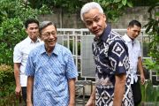 Calon Presiden Ganjar Pranowo (kiri) dan Wakil Presiden ke-11 RI Boediono (kanan) menjawab pertanyaan wartawan di kediamannya di Menteng, Jakarta Pusat, Jumat (24/11/2023). Kunjungan Capres nomor urut 3 tersebut dalam rangka bersilaturahim serta berdiskusi terkait sistem birokrasi pada era Boediono menjabat dan membahas perekonomian Indonesia di masa sekarang. ANTARA FOTO/Sulthony Hasanuddin/foc.