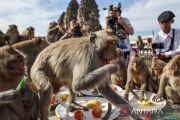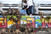 Warga memberikan telur kepada monyet selama berlangsungnya Festival Monyet Tahunan di Provinsi Lopburi, Thailand, Minggu (26/11/2023). Festival monyet itu sukses membantu mempromosikan pariwisata Lopburi kepada wisatawan internasional setiap tahunnya. ANTARA FOTO/REUTERS/Chalinee Thirasupa/Spt.