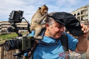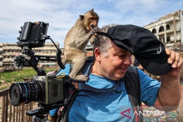 Seorang juru kamera bereaksi saat seekor monyet melompat ke dirinya selama berlangsungnya Festival Monyet Tahunan di Provinsi Lopburi, Thailand, Minggu (26/11/2023). Festival monyet itu sukses membantu mempromosikan pariwisata Lopburi kepada wisatawan internasional setiap tahunnya. ANTARA FOTO/REUTERS/Chalinee Thirasupa/Spt.