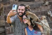 Wisatawan berswafoto dengan monyet selama berlangsungnya Festival Monyet Tahunan di Provinsi Lopburi, Thailand, Minggu (26/11/2023). Festival monyet itu sukses membantu mempromosikan pariwisata Lopburi kepada wisatawan internasional setiap tahunnya. ANTARA FOTO/REUTERS/Chalinee Thirasupa/Spt.