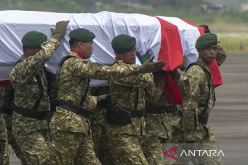 Sejumlah prajurit TNI AD mengangkat peti jenazah prajurit Satgas Yonif Mekanis Raider 411/Pandawa Kostrad yang gugur di Papua saat tiba di Lanud Adi Soemarmo, Boyolali, Jawa Tengah, Senin (27/11/2023). Empat prajurit tersebut adalah Praka Yipsan Ladou, Praka Dwi Bekti Probo Siniwoko, Pratu Miftahul Firdaus, dan Prada Darmawan, gugur saat baku tembak dengan kelompok kriminal bersenjata (KKB) di Distrik Paro, Kabupaten Nduga, Papua. ANTARA FOTO/Aloysius Jarot Nugroho/Spt.
