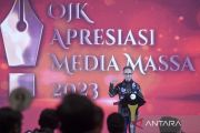Ketua Dewan Komisioner Otoritas Jasa Keuangan (OJK) Mahendra Siregar menyampaikan pidato saat OJK Apresiasi Media Massa 2023 di Jakarta, Senin (27/11/2023). OJK Apresiasi Media Massa 2023 merupakan penghargaan dari OJK kepada media massa yang menjaga akuntabilitas dan pertanggungjawaban lembaga pengawas sektor jasa keuangan tersebut kepada publik. ANTARA FOTO/Hafidz Mubarak A/Spt.