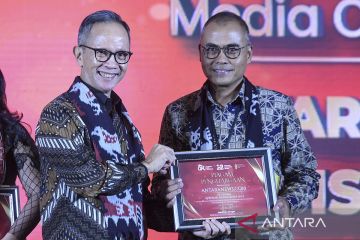 Ketua Dewan Komisioner Otoritas Jasa Keuangan (OJK) Mahendra Siregar (kiri) memberikan piagam penghargaan OJK Apresiasi Media Massa 2023 kepada Direktur Pemberitaan LKBN Antara Irfan Junaidi di Jakarta, Senin (27/11/2023). OJK Apresiasi Media Massa 2023 merupakan penghargaan dari OJK kepada media massa yang menjaga akuntabilitas dan pertanggungjawaban lembaga pengawas sektor jasa keuangan tersebut kepada publik. ANTARA FOTO/Hafidz Mubarak A/Spt.
