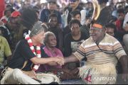 Calon presiden nomor urut tiga Ganjar Pranowo (kiri) berjabat tangan dengan Kepala Kampung Wendu Matara Kalimus Mahuse (kanan) saat melakukan kampanye perdana di Distrik Semangga, Merauke, Papua Selatan, Selasa (28/11/2023). Dalam tatap muka itu, Ganjar Pranowo menemui warga dusun Waninggap Nango, Matara dan Urumb dengan mencanangkan program satu desa satu puskesmas. ANTARA FOTO/M Risyal Hidayat/rwa.