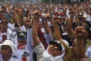 Seorang anggota Asosiasi Pemerintah Desa Seluruh Indonesia (Apdesi) mengenakan kaos Mantan Presiden Soekarno saat berunjuk rasa di depan kompleks Parlemen, Jakarta, Selasa (5/12/2023). Mereka menuntut segera direvisinya UU Nomor 6 Tahun 2014 tentang Desa, salah satunya terkait pembahasan penambahan masa jabatan kepala desa dari 6 tahun menjadi 9 tahun dalam satu periode. ANTARA FOTO/Aditya Pradana Putra/foc.
