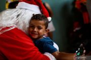 Motoris Helton Garcia mengenakan kostum Santa Klaus membagi hadiah pada anak sekolah di desa Santo Antonio do Descoberto, Goias, Brazil, Minggu (10/12/2023). ANTARA FOTO/REUTERS/Adriano Machado/foc.