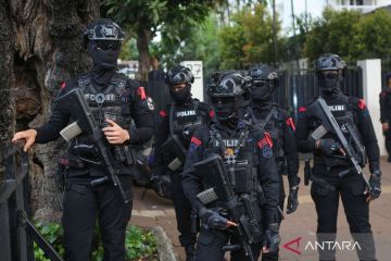 Sejumlah polisi berjaga di area debat Capres-Cawapres 2024 di sekitar Kantor KPU, Jakarta, Selasa (12/12/2023). Sebanyak 2.120 personel gabungan dari TNI, Polri, dan instansi terkait dikerahkan untuk mengamankan debat perdana Capres-Cawapres. ANTARA FOTO/Asprilla Dwi Adha/aww.