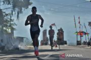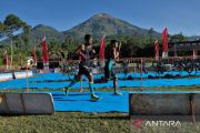 Peserta berlari saat Sindoro Sumbing Duathlon #4 di kawasan kebun teh Blembem lereng gunung Sindoro di Desa Pagerejo, Kertek, Wonosobo, Jawa Tengah, Sabtu (16/12/2023). Gabungan lomba lari dan bersepeda tersebut diikuti oleh puluhan atlet dari berbagai provinsi di Indonesia memperlombakan lima kategori yang bertujuan untuk menjaring atlet-atlet potensial sekaligus mempromosikan wisata olahraga di Wonosobo. ANTARA FOTO/Anis Efizudin/pras.