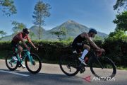 Peserta mengayuh sepeda saat Sindoro Sumbing Duathlon #4 di kawasan kebun teh Blembem lereng gunung Sindoro di Desa Pagerejo, Kertek, Wonosobo, Jawa Tengah, Sabtu (16/12/2023). Gabungan lomba lari dan bersepeda tersebut diikuti oleh puluhan atlet dari berbagai provinsi di Indonesia memperlombakan lima kategori yang bertujuan untuk menjaring atlet-atlet potensial sekaligus mempromosikan wisata olahraga di Wonosobo. ANTARA FOTO/Anis Efizudin/pras.